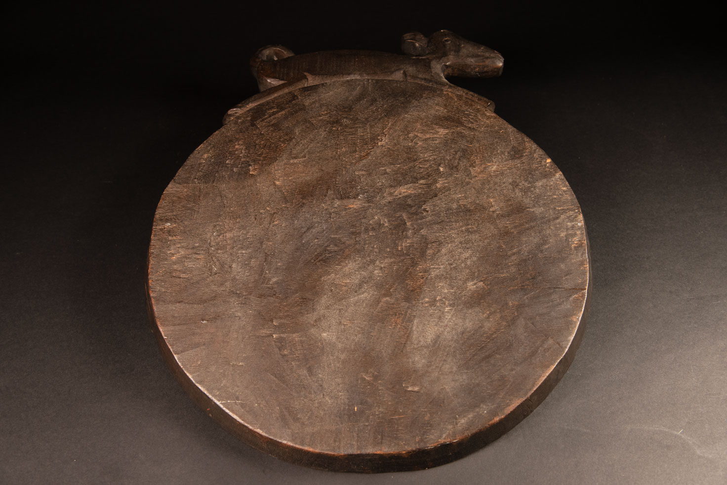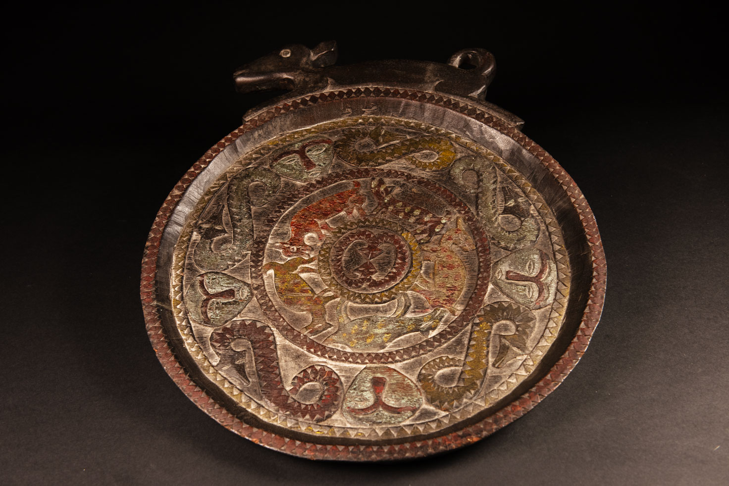 Carved with snakes, human faces, and game animals such as deer and wild boar. The snakes symbolize the family’s nobility, the animals represent both an abundant harvest and hunting prowess, while the human faces embody honor, the warrior’s courage, and spiritual power. The tray is topped with a sculpture of a deer, most likely emphasizing the hunting role of the head of the family, and was once painted with yellow, red, and white pigments that have faded over time.